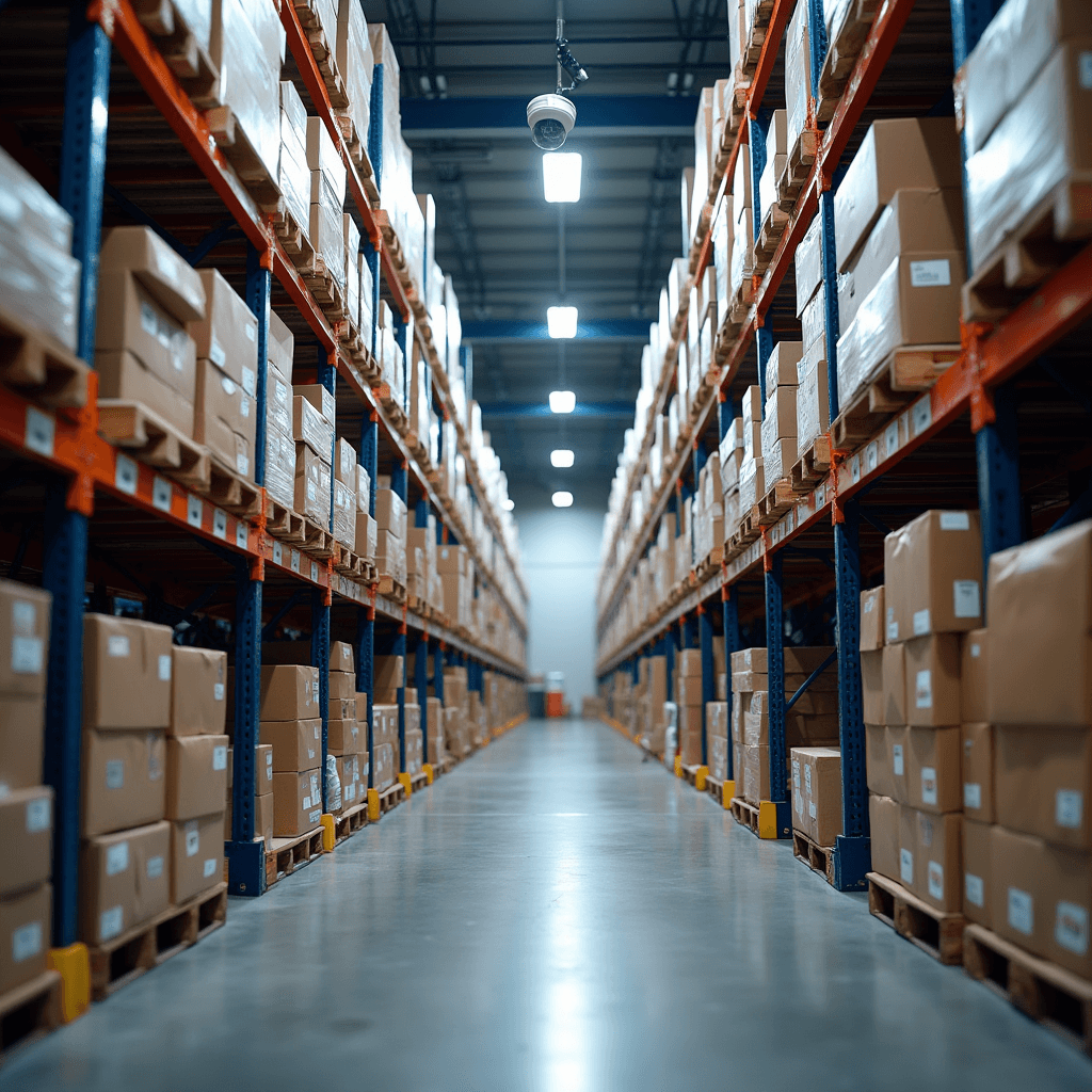 Полное покрытие всех складских помещений и стеллажей камерами видеонаблюдения для обеспечения безопасности и контроля.